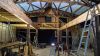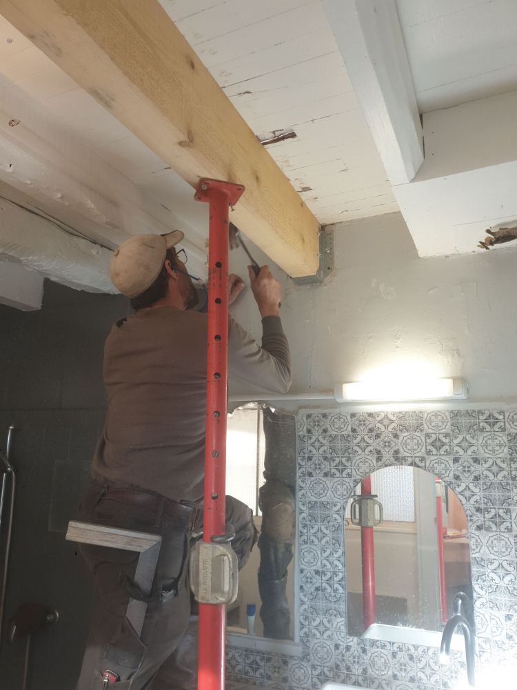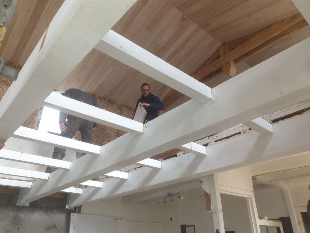 * pose des solives de la mezzanine pour rebouchage du chevêtre de l'ancien escalier.