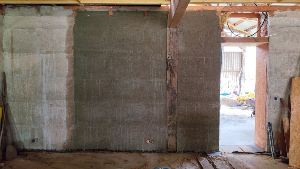 - édification des murs intérieurs principaux, notamment un mur en terre très légèrement paillé pour qu'il soit le plus lourd possible pour l'inertie, agrémenté de serpentins en muticouche pour en faire un mur chauffant et un stockage d'énergie.