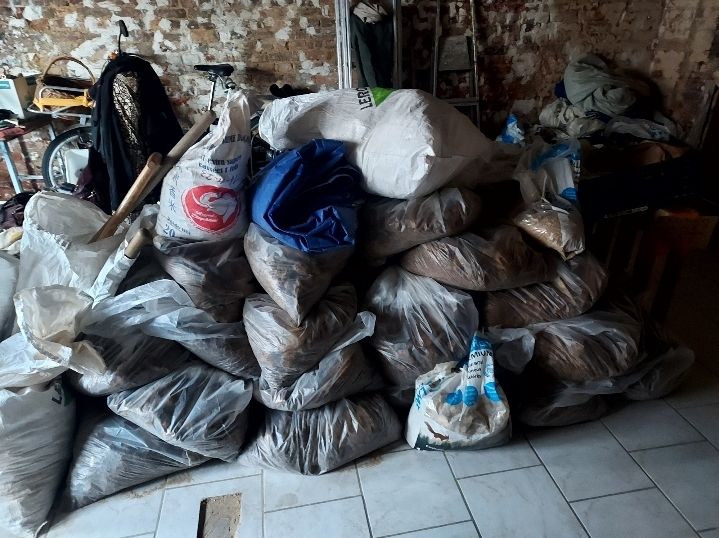 Nous avons été chercher de la terre argileuse chez des particuliers à la suite d'un terrassement de grande ampleur. Résultat des courses : plusieurs coups de pelle, quelques heures de travail et nous repartons avec presque 60 sacs de terre, soit 1,5 tonnes (en deçà de notre objectif initial mais tout de même).
