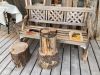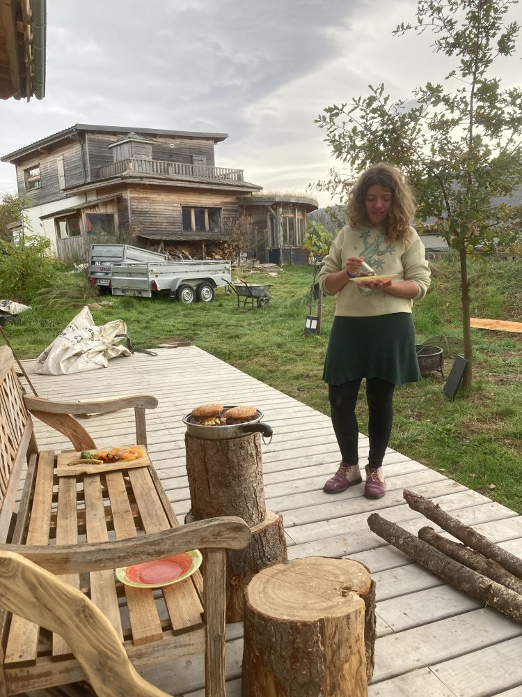 Le chantier ressemble de plus en plus à une maison. Burger s pour midi avant de reprendre le chantier. Le banc en bois a été récuperé à la déchèterie et rafistolé. Et les planches à découper sont des chutes de bois poncées.