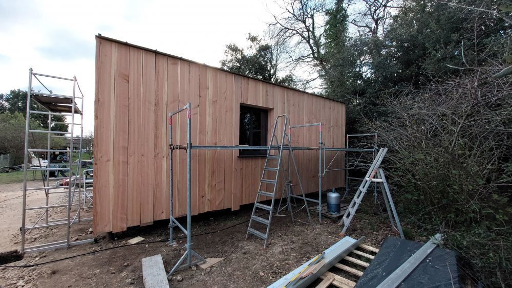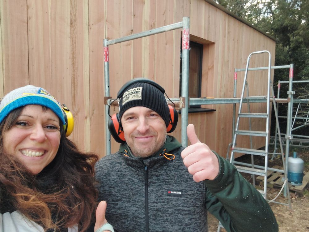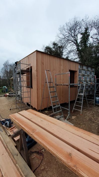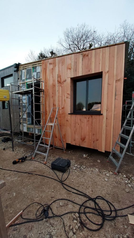 Le 24 décembre c'est avec Pascal que nous avons posé l'ensemble du bardage de la façade Nord, une étape ultra satisfaisante car en une journée seulement , toute la façade a été recouverte de bois!!