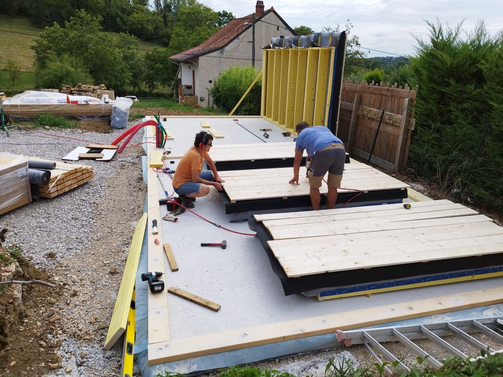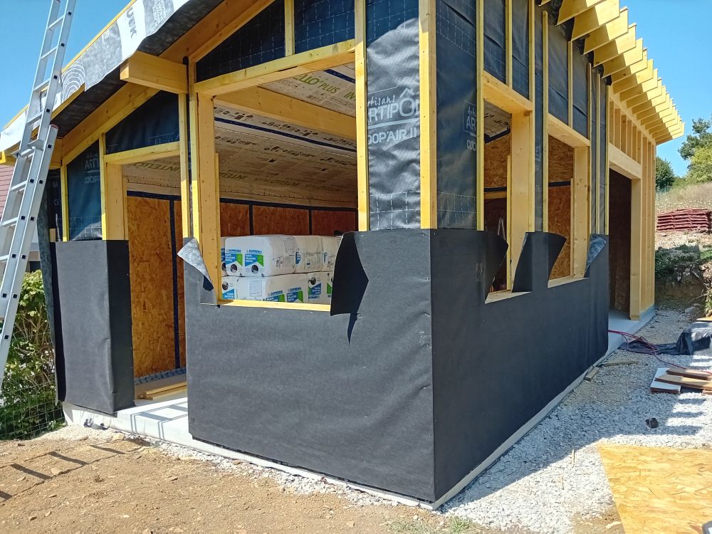 En limite de propriété et sans accès depuis chez la voisine, nous avons monté les murs de la façade ouest par panneaux successifs entièrement finis (jusqu’au bardage). Pour le reste : ossature, charpente, pare pluie, frein vapeur, passage des réseaux électriques, et insufflation de la ouate de cellulose à la cardeuse ont été réalisé avec l’aide d’un copain artisan.