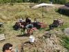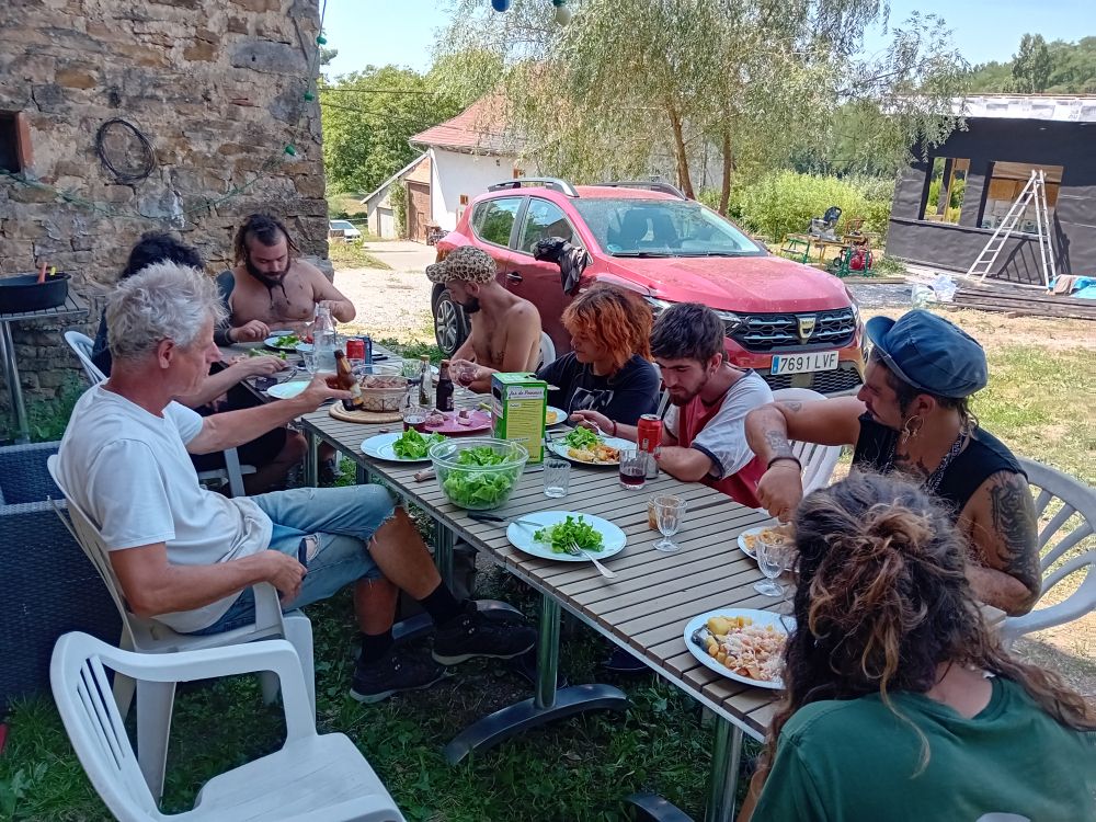 Le brossage des tuiles avant de les remettre sur le nouveau toit, comme la chaîne de dé-tuilage fut l’occasion une fois encore d’un repas joyeux avec les copaines !