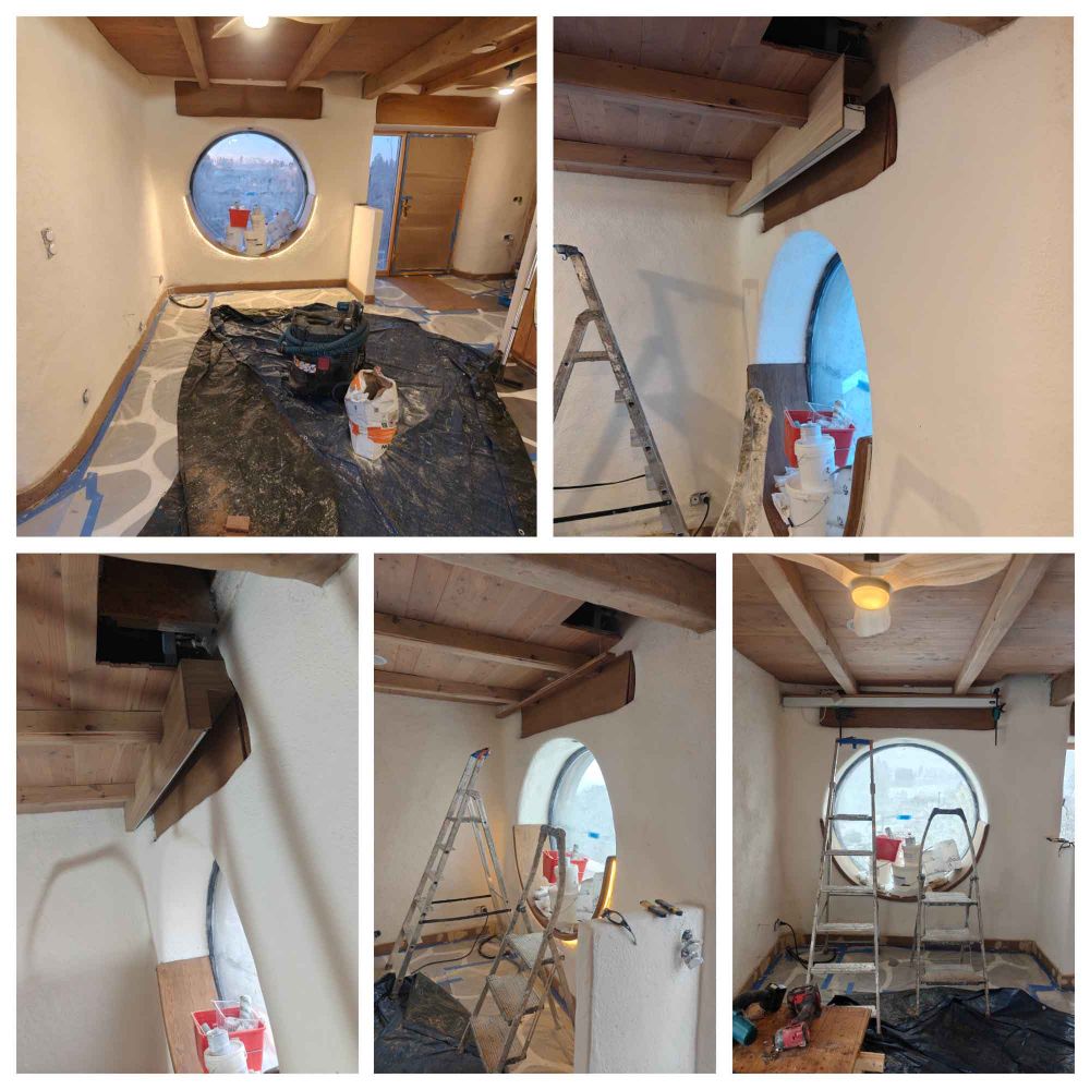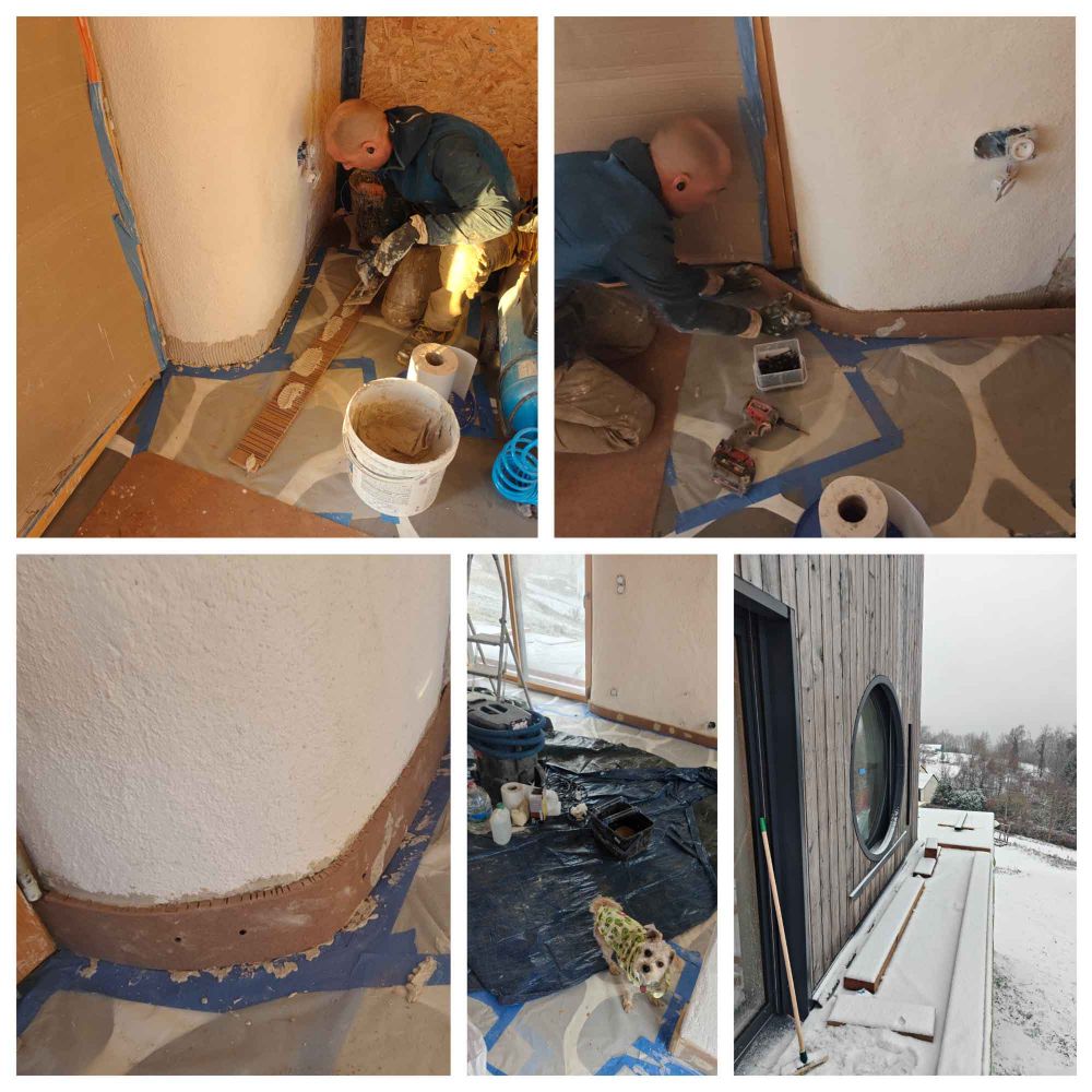 peintures, vernis, finitions du béton ciré, ameublement (meuble pivotant bibliothèque / table / lit), salle de bain, plomberie, jacuzzi, fin de l’assainissement, dalle et muret du hangar, puis ossature bois.