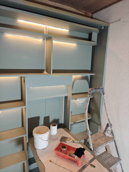 Niveau laser en mode ligne rouge, dégrossis au mortier chaux, sable et pierre ponce (pour les bas de murs humides)...Afficher la suite Cet hiver, pendant que la pluie fait du zèle dehors, le chantier lui, se passe au laser dedans!