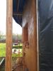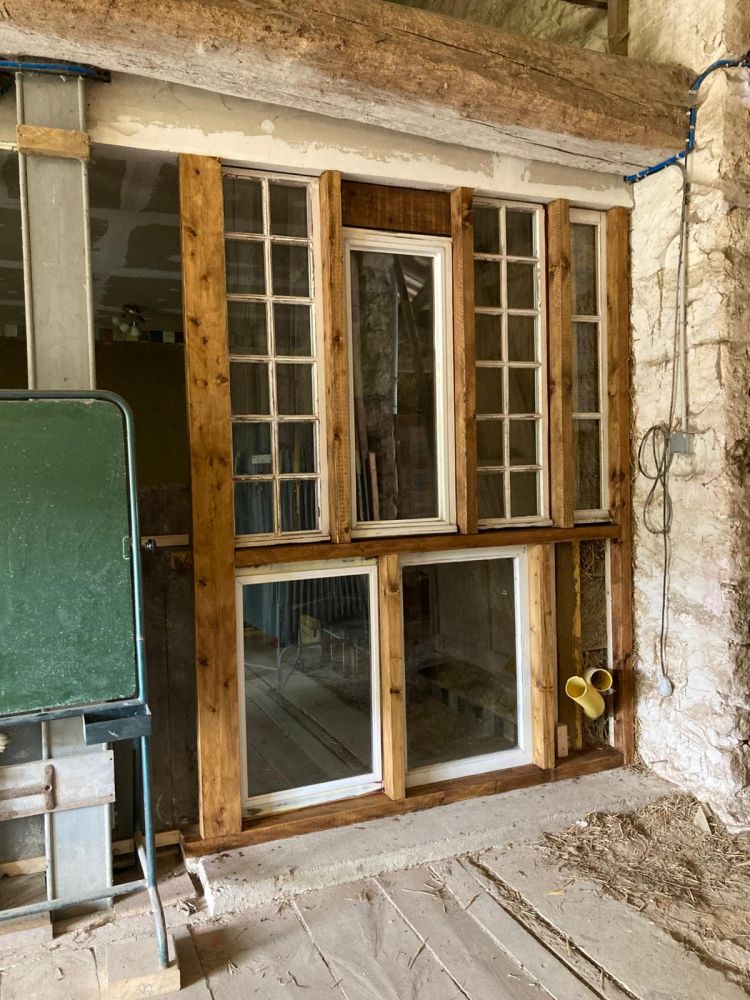 Par manque de moyens, on a utilisé des bastaings en pin qu'il a fallu teinter pour que le rendu soit plus harmonieux avec la ferme. Pour cela, on a...Afficher la suite La partie bois de la façade vitrée est enfin terminée ! Il ne restera que le garde-corps en verre à poser quand plus rien ne sera à craindre.