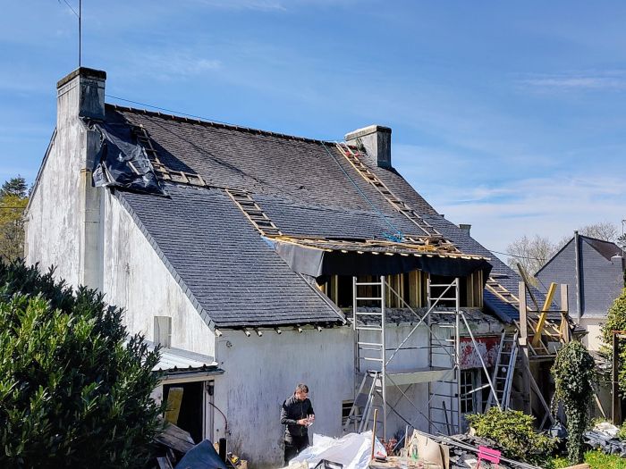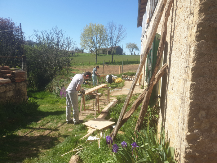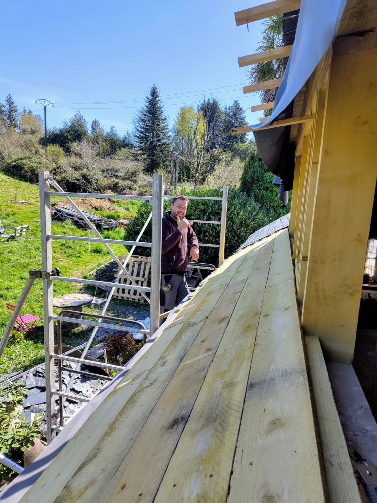 Christophe a continué à poncer courageusement tout le plafond en lambris peuplier ainsi que les fermes en chêne, et ça donne un...Afficher la suite C'est l'été en avril, même si ce n'est pas rassurant pour les températures futures, il faut dire que c'est toujours plus agréable de travailler au soleil :-)