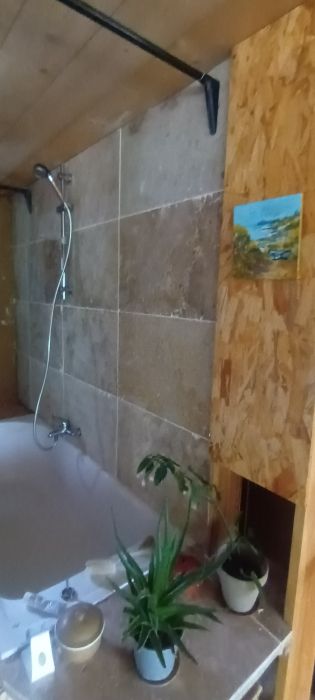 En attendant, j'ai posé le travertin dans la salle de bain.