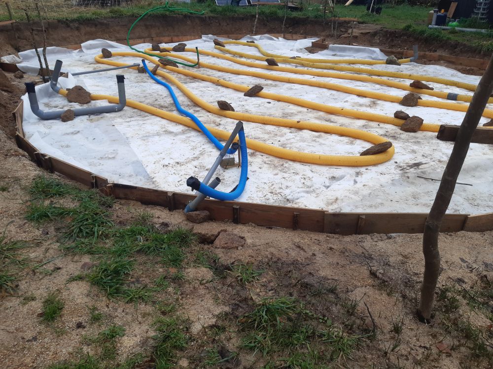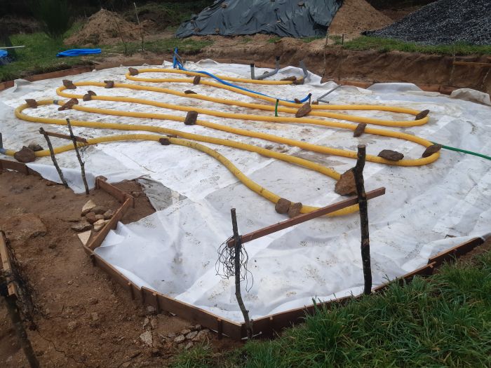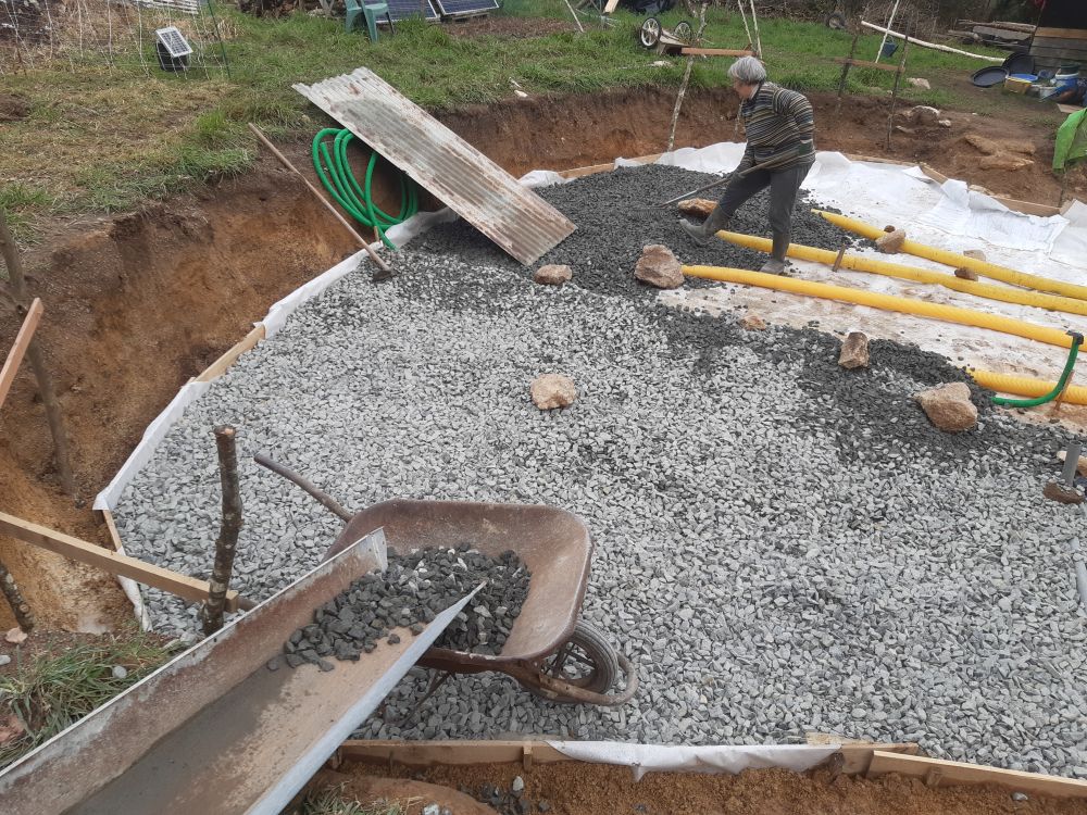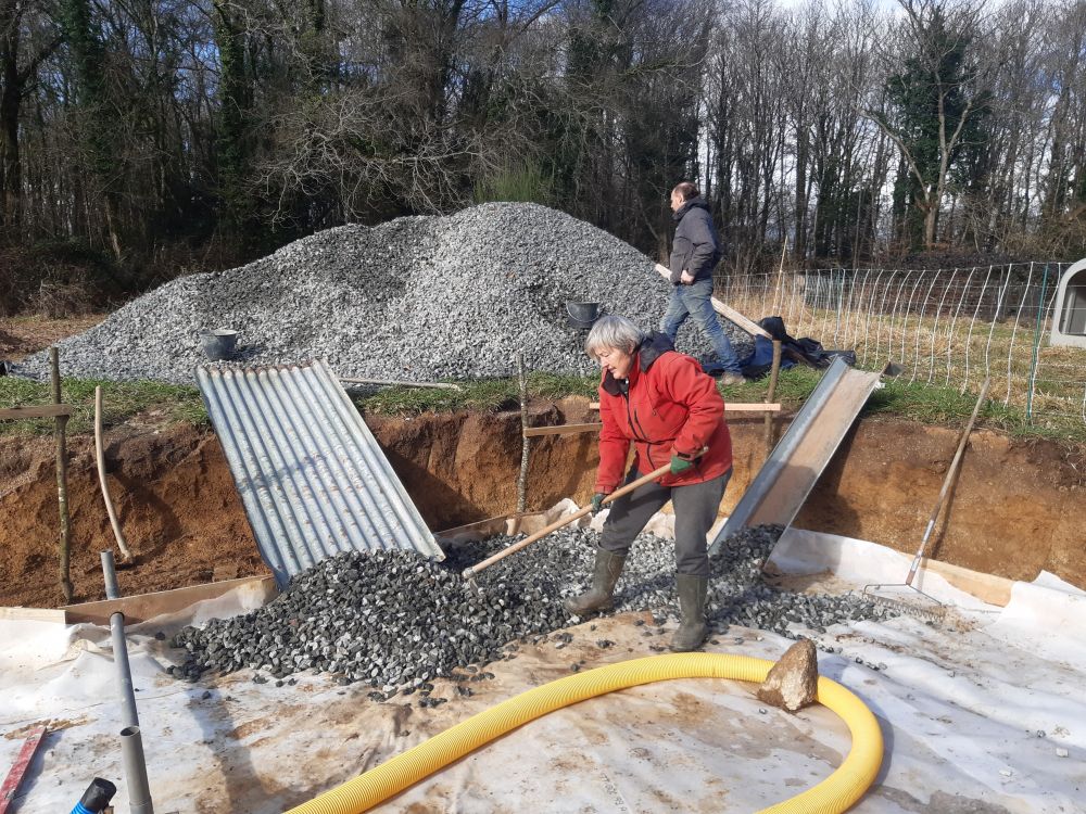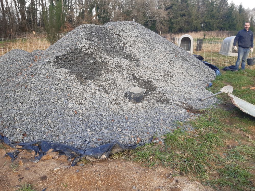 Passons a la mise en place de la ventilation du hérisson aussi bien pour réguler l'humidité que pour lutter contre le Radon très présent en bretagne...puis nous avons dû mettre 40 tonnes de graviers 20x40 par dessus toutes ces gaines ..., nous avons utilisé notre imagination pour trouver...Afficher la suite Passons a la mise en place de la ventilation du hérisson aussi bien pour réguler l'humidité que pour lutter contre le Radon très présent en bretagne...puis nous avons dû mettre 40 tonnes de graviers 20x40 par dessus toutes ces gaines ..., nous avons utilisé notre imagination pour trouver pleins de techniques différentes, dont les gouttières soit dans la brouette soit direct dans le hérisson vu que nous avions une pente...