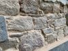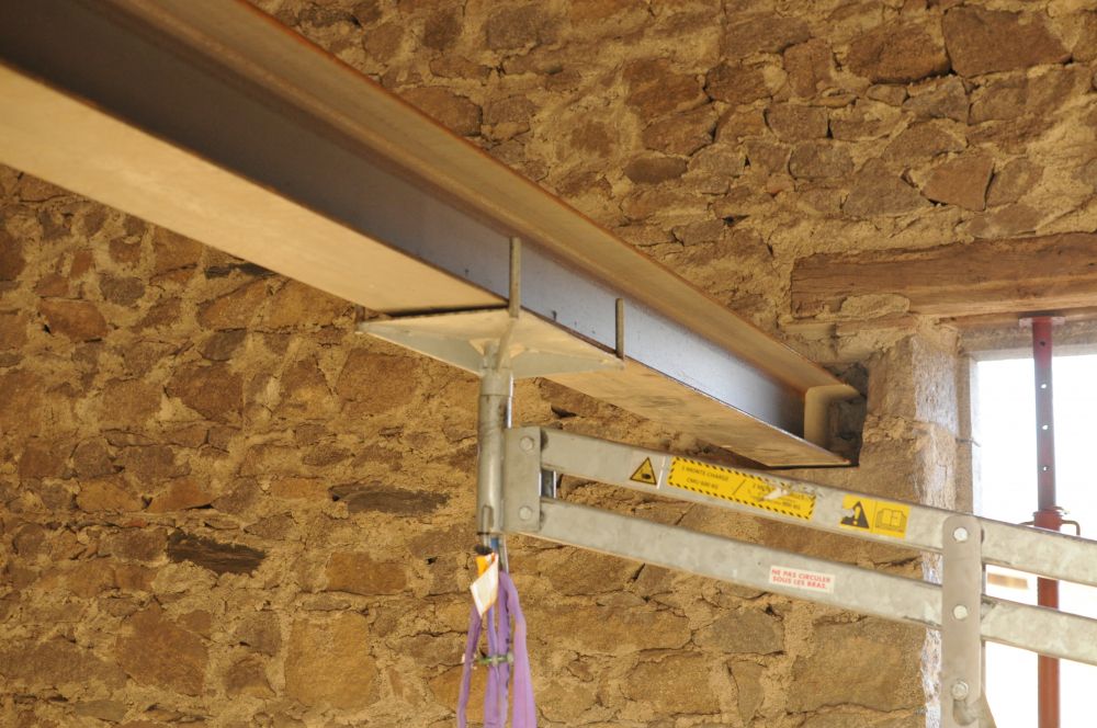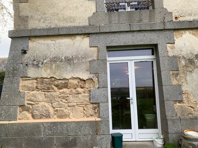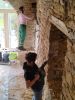 Pour le mur Sud, avec l’ouverture principale de la pièce et sa voute, un enduit « à pierre vue » a été réalisé avec le même enduit gratté entre chaque pierre.