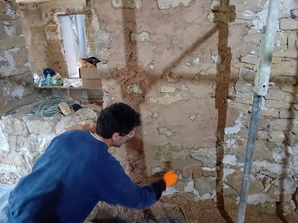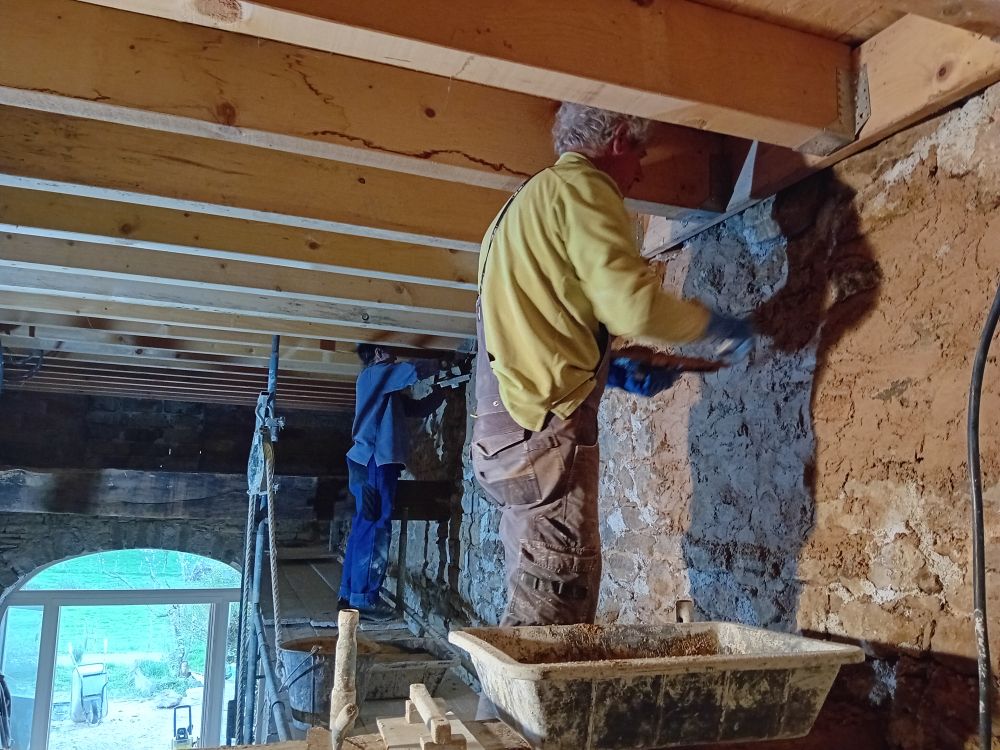 Le mur Ouest, biscornu ++, a retrouvé une cohérence de surface par l’application d’un premier enduit de rempochage, recouvert d’un enduit « beurré » chaux-sable et pigment, partiellement gratté pour faire ressortir les nez de pierres les plus chouettes.