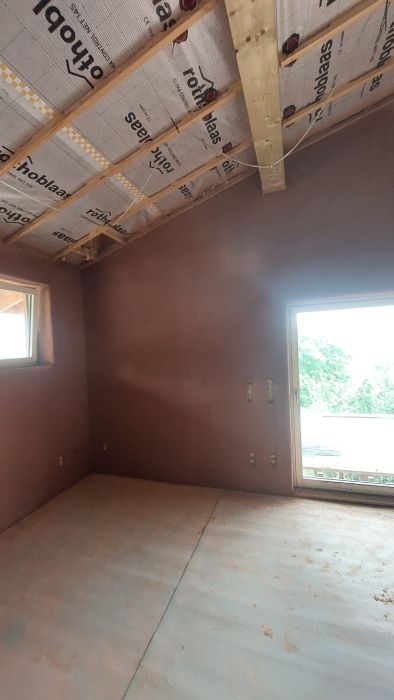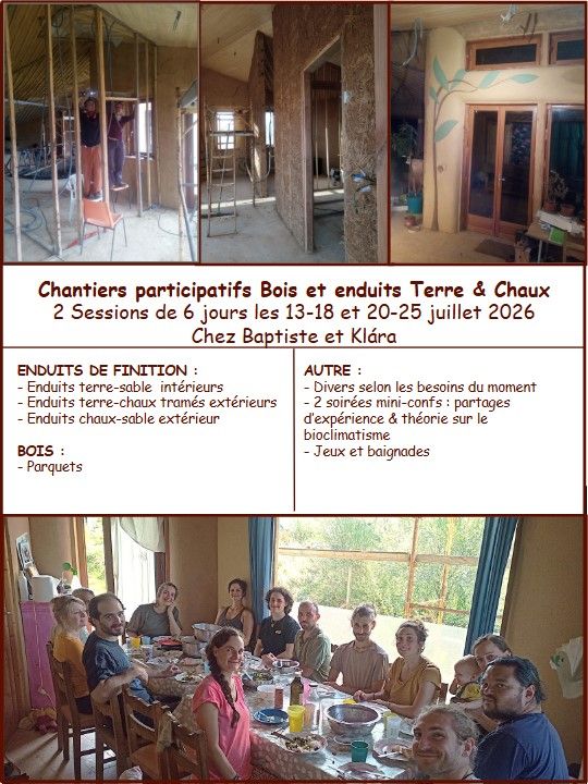 Ça fait 3 mois qu'on a pas donné de nouvelles, mais on a pas chômé ! Aux menus, des corps d'enduit terre-sable-paille haché, des enduits de finition terre-sable-lin ou chanvre. C'est long, surtout pour tamiser la barbotine, mais on est contents du résultat. Du plâtre sinon, une percée en...Afficher la suite Ça fait 3 mois qu'on a pas donné de nouvelles, mais on a pas chômé ! Aux menus, des corps d'enduit terre-sable-paille haché, des enduits de finition terre-sable-lin ou chanvre. C'est long, surtout pour tamiser la barbotine, mais on est contents du résultat. Du plâtre sinon, une percée en toiture pour la fumisterie du futur poêle de masse et trouée dans la butte nord pour recevoir les bouteilles de propane de la gazinière. Un grand MERCI à Sarah, Lary, Florian, Coralie, Agnès et Stéphane !!!