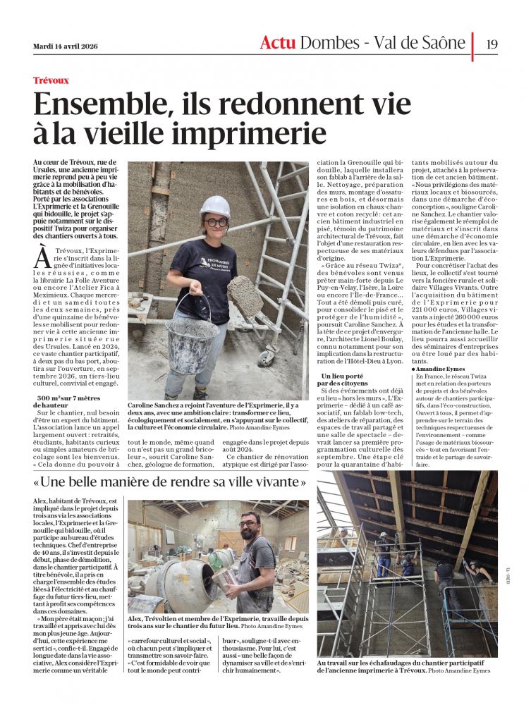 La tente atelier est montée , l'espace bénévole aussi on attend plus que vous d'ailleurs jai eu une annulation dune personne pour cette semaine alors si vous etes dispo ne serait-ce qune journee on est preneur, je nai pas inscrit cette semaine dans les chantiers car cest le montage du...Afficher la suite La tente atelier est montée , l'espace bénévole aussi on attend plus que vous d'ailleurs jai eu une annulation dune personne pour cette semaine alors si vous etes dispo ne serait-ce qune journee on est preneur, je nai pas inscrit cette semaine dans les chantiers car cest le montage du campement, mais aussi apporter tous le materiel sur place mais aussi la 1 ere phase des murs porteurs ....alors vous etes les bienvenues repas et bonne huleur au rdv