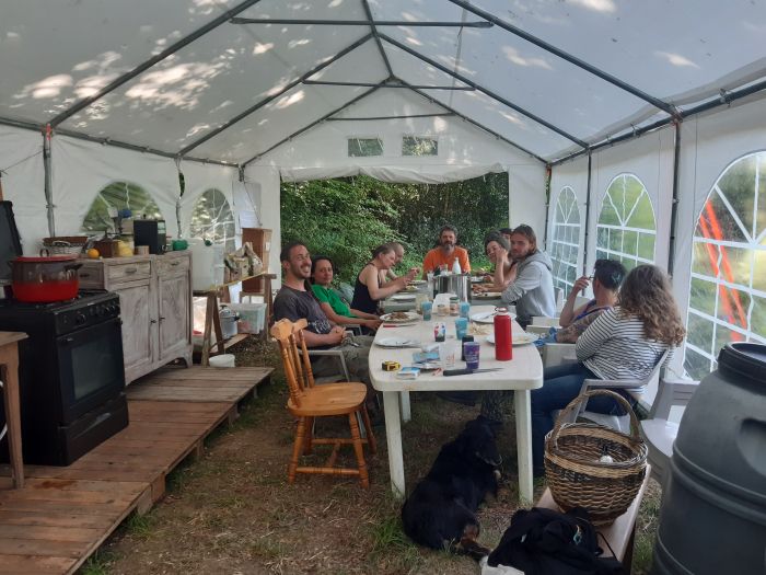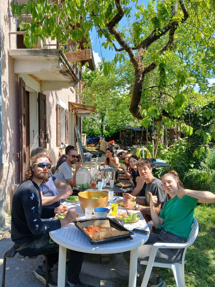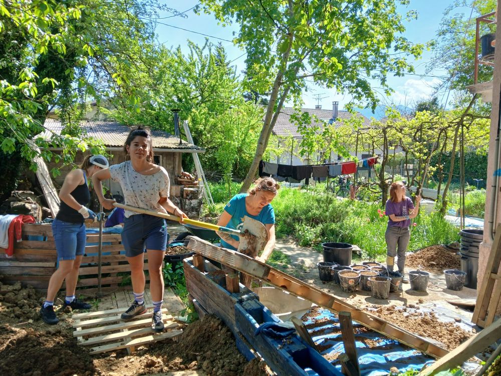Quelques photos pour illustrer la dimension alimentaire du projet : Potager, plantation d'arbres en synthropie (fruits, petits fruits, plantes aromatique et medicinales) semis a l'ancienne en couche chaude...