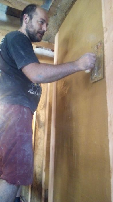 - semaine du 5 août - rebouchage et finition en terre sur un mur de masse en terre crue.