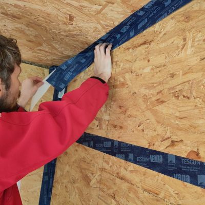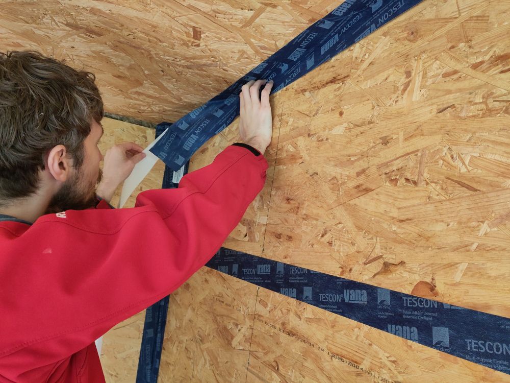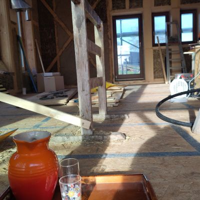 - Préfabrication des murs en paille dans une ancienne étable à proximité et application d’une première couche de terre crue (fini).