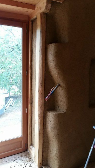 Tout est prêt pour la pose des enduits terre réalisés à partir de terre très argileuse et locale. Le chantier est encadré par Eric Handrich.