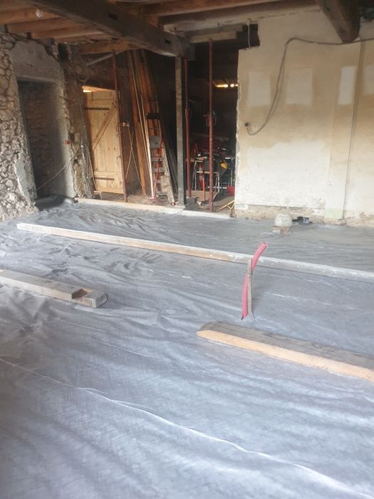 Construction d'une ossature bois pour accueillir la future projection chaux/chanvre.