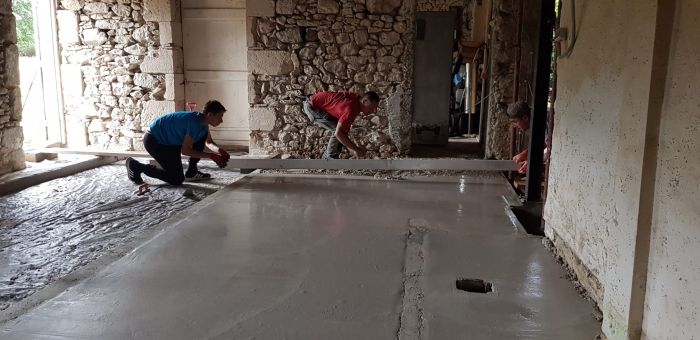 Création de deux ouvertures dans les murs en pierre de 50 cm pour les futurs baies vitrées.