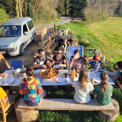 J'adapte les chantiers à la météo (intérieur/extérieur). De plus, pour se mettre au chaud, il y a l'atelier et un tipi, tous deux équipés d'un poêle à bois.