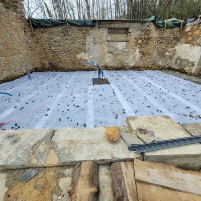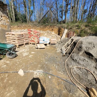 Nous utilisons au maximum des matériaux nobles et simples. Par exemple, nous avons la chance d'avoir une excellente terre à bâtir qui sert aux murs, dalles et enduits intérieurs. De plus, des arbres plantés par l'ancien propriétaire sont en âge d'être récoltés pour créer la charpente. Ils seront sciés et taillés sur place. Le bois ne sortira même pas du terrain.