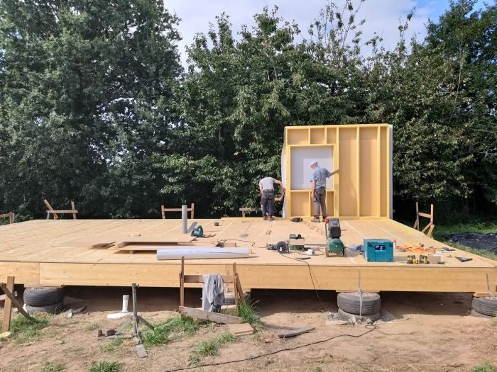- mi-août : construction et isolation de la dalle bois (début de ces travaux prévus entre le 10 et le 16 août, selon le nombre de personnes présentes début août...)