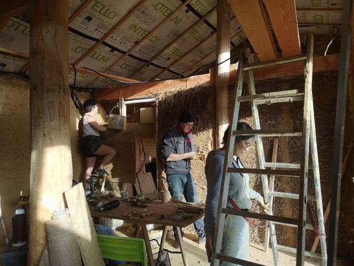 Octobre 2022 : je participe à l'animation d'ateliers pendant un week end avec l'association Hameaux Légers pour permettre à des collectifs de se rencontrer pour monter un hameau à Guipel (35). J'y rencontre pleins de gens supers, et on postule ensemble avec notre nouveau collectif Les Alouettes pour un terrain communal de 4500 m2. Après 20 mois de cheminements, préparations et insomnies, on va pouvoir commencer à construire nos habitats ! A terme, 9 foyers seront installés - pour le moment on est 6 et on monte des yourtes, une maison en bois modulable et... Ma maison…!