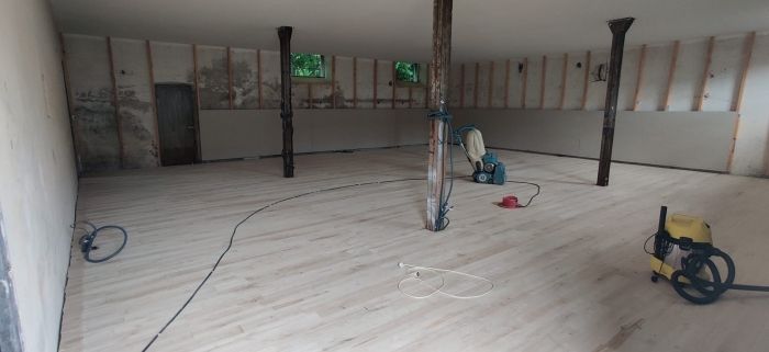 - Cloisonnement de l’espace “annexe”, création d’un vestiaire, d’un point d’eau et de WC (toilettes sèches)