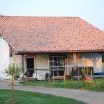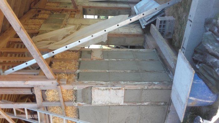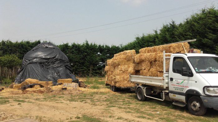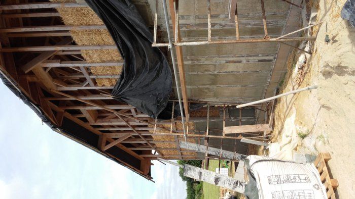 Nous avons fait le terrassement, le soubassement, l’ossature en bois, un hangar et voici le moment de faire l’isolation : en rentrant les bottes de paille entre les montants de l’ossature bois . Sans compression, les bottes de paille sont enduites par banchage avec un mortier léger (4 sciures, 3 sables, 1 chaux et 1 ciment).