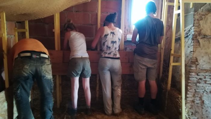 Depuis le début de l'été nous accueillons des wwoofeurs qui nous aident au jardin, mais aussi à la vie de la ferme et au chantier mais concernant ce dernier nous ne sommes pas assez nombreux, le terre-paille étant très simple à mettre en oeuvre mais très long à finaliser!