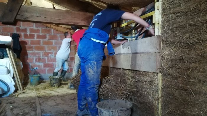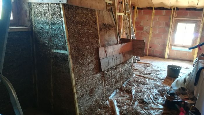 Le chantier terre-paille est situé à l'étage de notre maison (qui accueillera les chambres des futurs enfants ;)) et qui nous permet d'isoler les murs en briques.