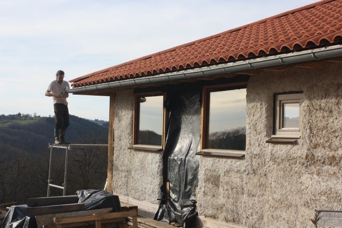 Nous avons choisi de bâtir notre maison en bois (ossature poteaux-poutres et charpente chevrons porteurs), avec isolation des murs en bottes de paille sur chant, enduites de terre à l'intérieur et de chaux ou bardées de bois à l'extérieur.