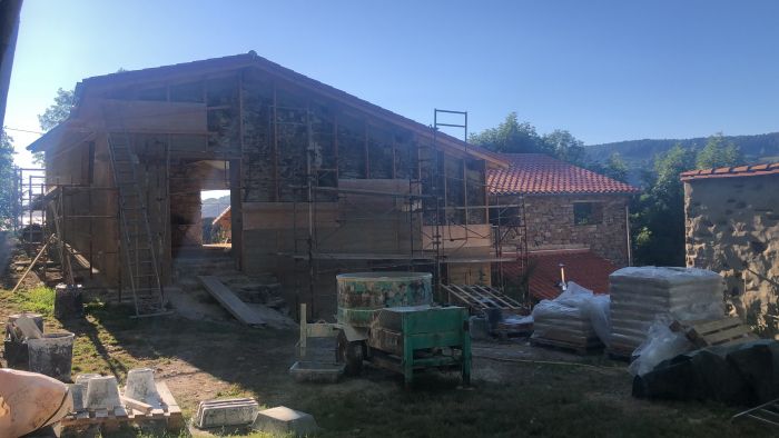 La bâtisse est une ancienne grange en pierres brutes de plus de 100 m2 au sol, dont le gros oeuvre vient d’être refait. Il s’agit de procéder en deux étapes successives :