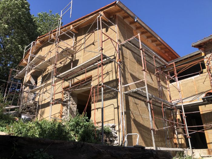 Le projet actuel est d'enrober une grange de 100 m2, en béton de chanvre banché, avec une technique que nous connaissons bien : chaux aérienne, ponce, chanvre, plâtre brut.
