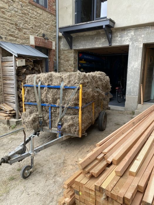 Travail assez simple de remplissage de caisson avec du chanvre en vrac.. Les bottes de chanvre sont à dépacter