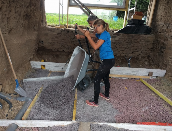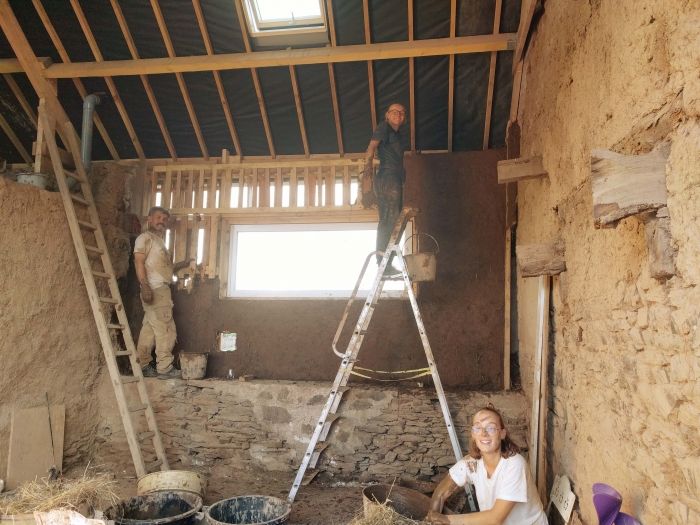 Nous avons la rénovation des murs en terre avec enduis terre et chaux-sable et le drain autour de la maison à terminer de creuse pour y mettre le revêtement puis les graviers.