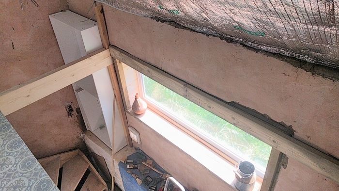Nous reprenons le chantier pour finir le lambri sous la toiture qui a été isolée en paille de lin et voliges.