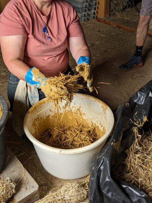 Nous prévoyons d'enduire la paille d'une seule couche de corps d'enduit composée d'argile, de sable et de paillettes de paille.