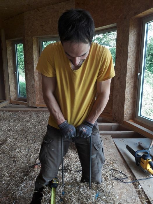 >> Isolation paille : travail des bottes , mise à dimension, rebotellage, compression, mise en place dans l'ossature bois.