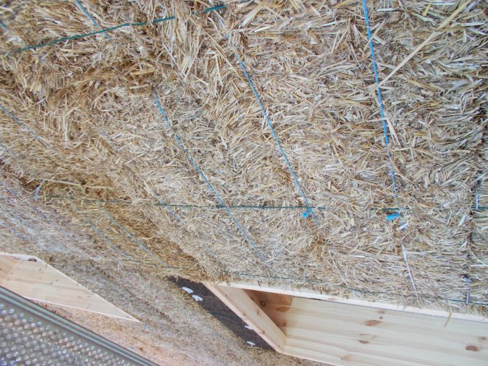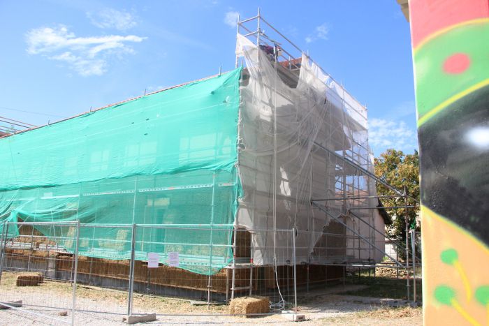 Nous allons isoler le bâtiment avec des bottes de paille. De manière classique, l’isolation en paille s’appuie sur une structure en bois placée contre la façade, dans laquelle s’insèrent les bottes. Dans la technique utilisée ici, les bottes sont fixées dans la façade par un système de crochets et de quadrillage acier reprenant l’ensemble de l’ouvrage. L’utilisation du bois est largement réduite, ce qui présente un intérêt économique et écologique.