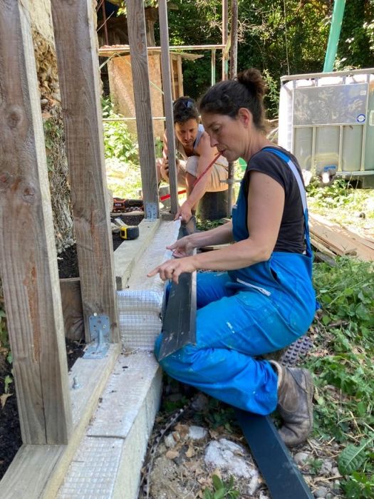 Nous ferons un chantier d’isolation par l’extérieur en paille ainsi que l'enduit qui va avec sur un des bâtiments du lieu. Il s'agit d'une ancienne grange en pisé dont nous avons rénové une partie. Il y a déjà un logement dans ce bâtiment, l'isolation devient donc une nécessité. La structure bois qui accueille les bottes de paille sera déjà en place. Nous avons également investit dans une pro-jeteuse pour faciliter l' étape de l'enduit sur cette grande surface.