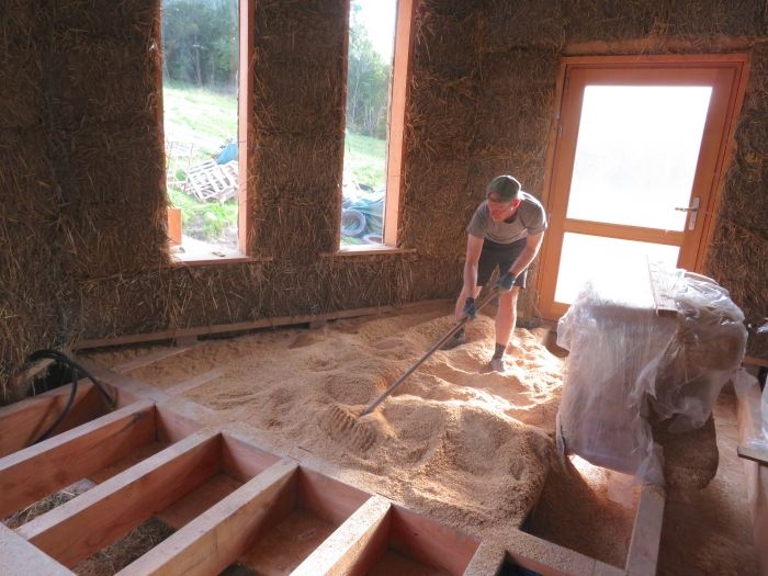 Il faut encore enduire des murs (et poser une vitre fixe), isoler le sol et poser les gaines électriques et conduites de l'eau sanitaire.