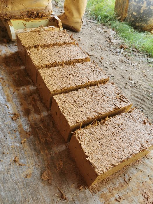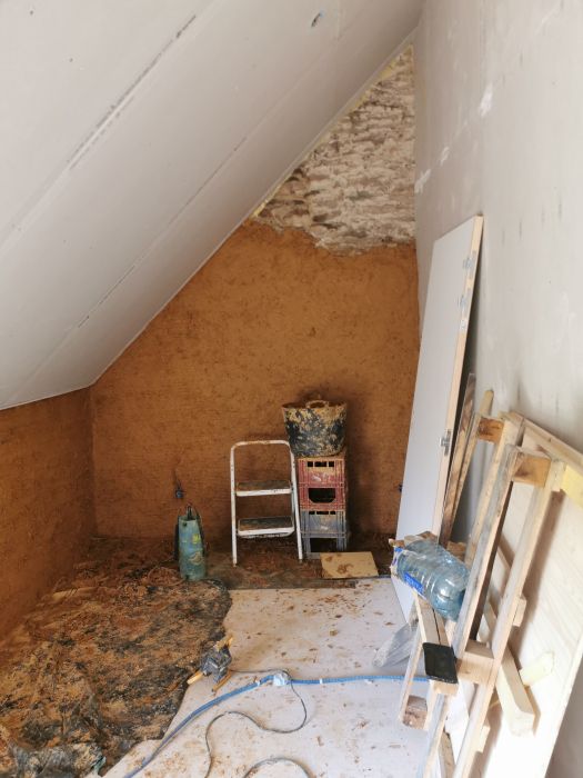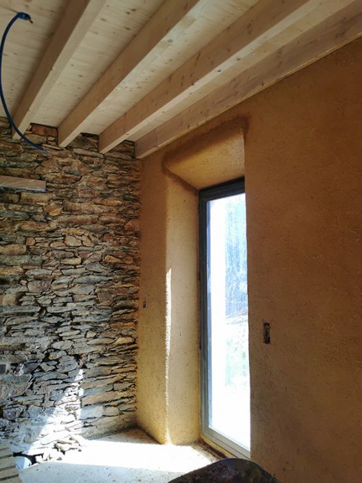 Le chantier de rénovation comprend l’isolation par l’intérieur de murs en vieilles pierres avec la terre de site et du miscanthus de production local. Un atelier confection de briques de terre crue à l’aide d’un moule est également prévu.