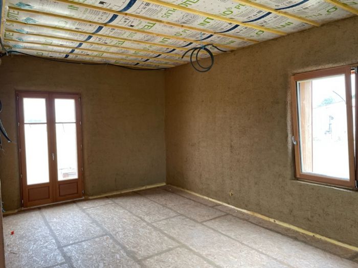 Notre maison est construite sur pieux et dalle bois. C’est une maison en bois de plain-pied. Elle est actuellement hors d’eau - hors d’air. Nous souhaitons réaliser un premier chantier pour la pose de la paille la semaine du 3 au 7 juillet, puis un second chantier du 31 juillet au 11 août pour les enduits terre.