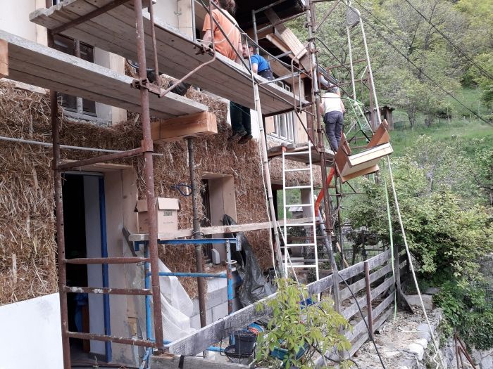 L'artisan fera une projection-machine d'enduits à la chaux sur la paille, pour laquelle nous serons en aide à la fabrication des enduits, la manipulation et la pose.