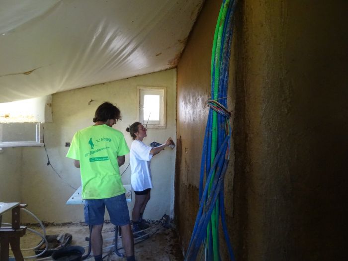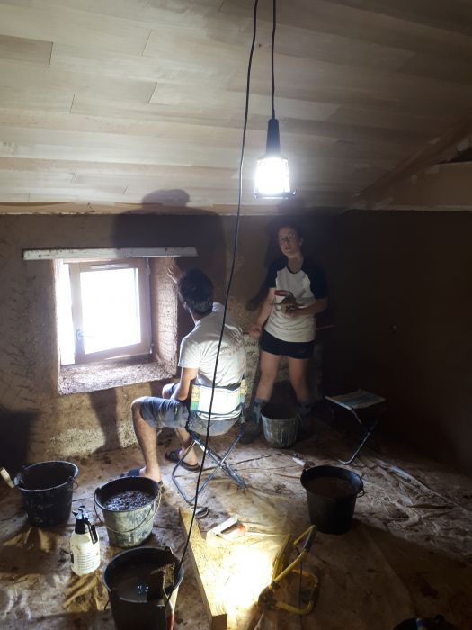Du 10 au 13 mai, du 15 au 18 mai, du 22 au 26 mai, du 30 au 9 juin et du 13 au 16 juin. Sur toute cette période, nous ferons de la correction thermique Terre/Chanvre dans un premier temps et cloisons Terre/Paille dans un second temps! Nous avons eu le plaisir d'être initié par un artisan spécialisé pendant deux jours. On a hâte de se perfectionner et de transmettre cette technique qui est très agréable, efficace et si simple à partir de la terre de notre terrain.
