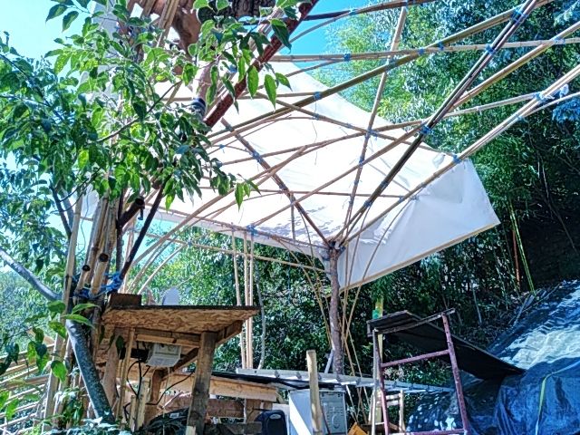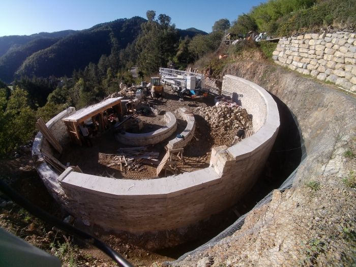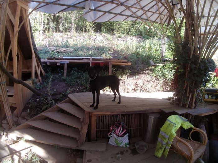 En annexe, nous construisons également des restanques selon la technique de la pierre sèche ardéchoise, une grande structure abritée en bambou avec cuisine d'été, salle de bain/toilette sèche et coin pause café/repas et une plateforme en bois pour installer une yourte.