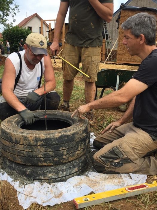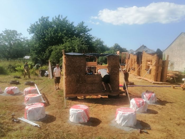 Poser les fondations (pneu + cailloux), Poser les murs préconstruits, construire 2 murs en paille sur place, commencer à faire le plancher, commencer la toiture.
