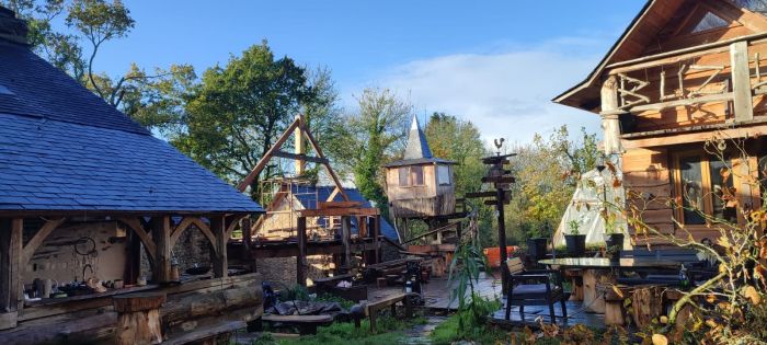 Nous sommes une petite famille de 5. Aladin, Jérômine, Athéna, Indira et Vénus. Nous représentons 3 générations différentes (1970, 2000, 2010) et nous retapons notre ancienne ferme dans le coeur du Finistère. Tout cela dans une ambiance très chaleureuse et conviviale car nous accueillons depuis toujours les amis qui souhaitent s’évader dans un lieu original et inspirant (il faut venir pour comprendre la magie de ce petit cocon appelé Buzuland). C’est un lieu très estival car majoritairement extérieur. La cuisine est couverte mais extérieure, les toilettes sont sèches, la douche est une cabane (assez sympa !) dans le jardin, il y a des grandes tables pour manger au soleil ou à l’ombre. Nous sommes proches d’une rivière aux fées bretonnes, pour les journées très chaudes, et notre lieu se prête très bien pour des soirées bien animées. En effet, nous y avons construit un grand écran en plein air, une piste de danse avec sa scène musicale extérieure. Des amis nous ont offert un bain nordique chauffé au bois qui régale nos soirées plus fraîches, pour précéder les retrouvailles au coin du feu. Avec tout ça nous proposons chaque année depuis 4 ans une semaine de festivités (musique, concert, olympiades, activités créatives, repas collectifs, temps calmes, spectacles, tables rondes, etc.)