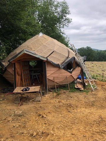 En mai 2022 nous avons acquis un terrain et construit : un garage/atelier en colombage, un bassin d'agrément filtrée en phyto, notre Tiny house et entamé la structure d’un Zome .